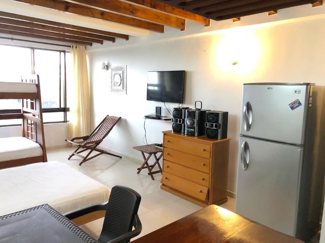 Apartamento con 1 dormitorio, cocina con lavavajillas, TV de pantalla plana, zona de estar y baño con ducha.